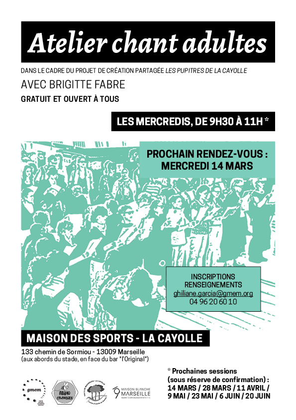 Parmi les pupitres, ensembles hétéroclites et bigarrés qui le composeront, l’atelier chant est le plus ouvert : y est accueilli qui le veut, y compris ceux qui n’ont aucune pratique musicale ou vocale. Les premières séances de ces ateliers vont être celles de l’expérimentation collective. Ensemble, nous allons chercher nos sons, les tester, les répéter, les retourner, les superposer, les étendres, les multiplier. L’esprit est celui d’une joyeuse et aventureuse expérimentation artistique…