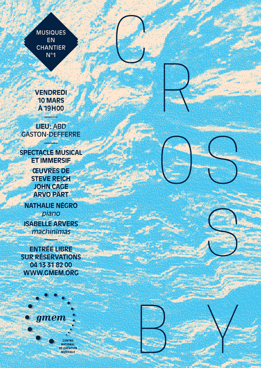 « Cross by » est né de la rencontre d’Isabelle Arvers et de Nathalie Négro lors d’une résidence artistique dans le Nord Pas de Calais. De la découverte mutuelle de leurs univers, des croisements se sont rapidement opérés, entre piano et jeu vidéo. Le travail d’Isabelle Arvers, spécialiste des machinimas, s’intéresse à leur mise en espace et à l’hybridation avec d’autres formes artistiques. Depuis quelques années, le travail de Nathalie Négro – pianiste – est traversé par l’exploration de la répétition des motifs musicaux. Dans le prolongement de cette recherche, elle revient à une forme plus resserrée autour de la pièce emblématique de Steve Reich « Piano phase » qui est le centre de gravité de « Cross by ».